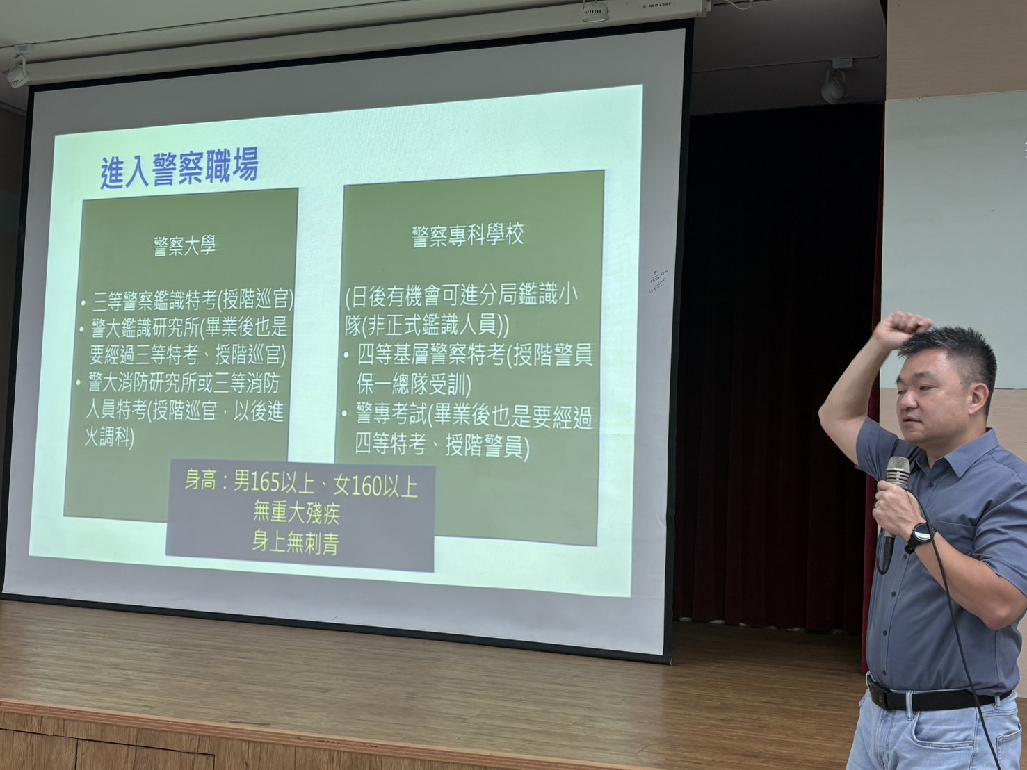 在講座中,聶警務正分享了進入警察及鑑識相關工作的途徑,如 警察大學、警專、研究所進修 等,並清楚說明相關資格條件,讓學生對未來職涯規劃有更明確的方向。他也以自身經歷勉勵學生:「立定未來目標、培養專業技能、避免投機取巧、強化外語能力」,才能在激烈的就業環境中掌握機會、脫穎而出。