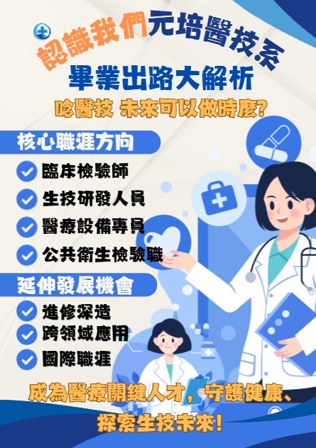 加入元培醫技系,讓你成為醫療團隊中最重要的「隱形英雄」,守護健康、推動醫療進步,並在臨床與研究領域展現專業價值。