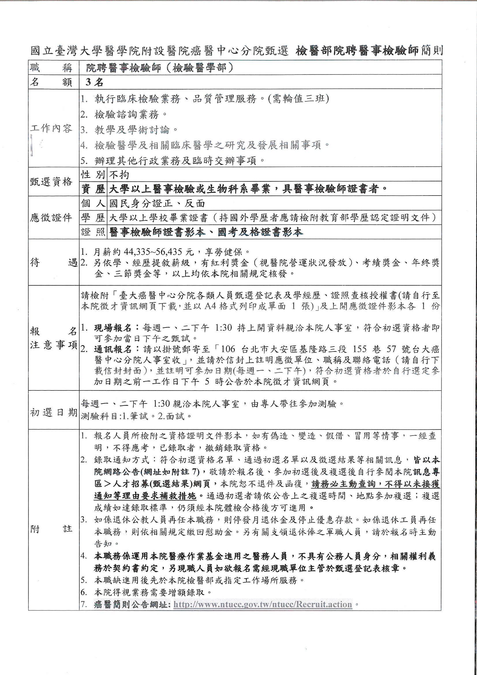 【國立臺灣大學醫學院附設醫院 聘醫事檢驗師共3名】