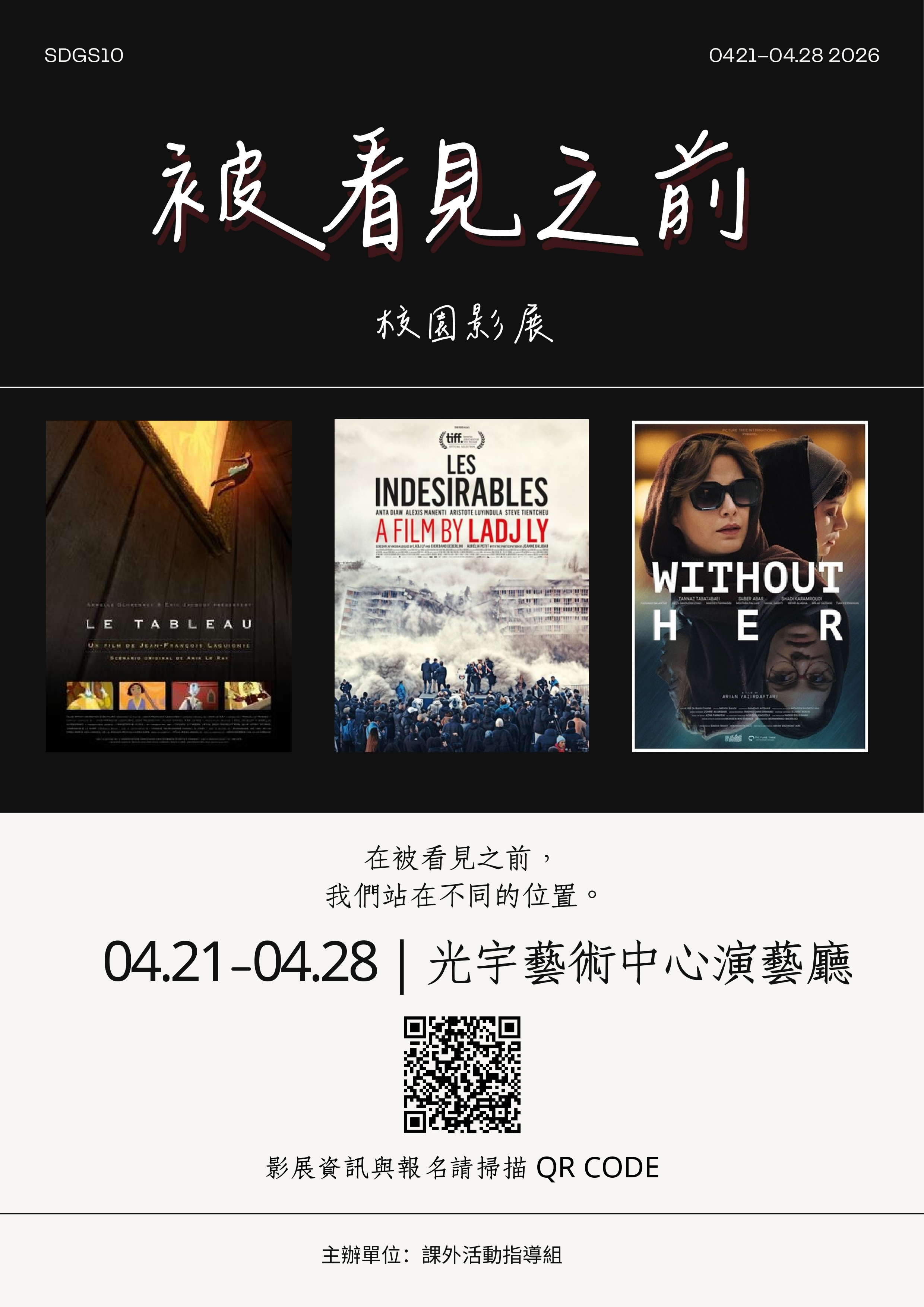 為促進校園多元觀點交流,並呼應 SDGs10「減少不平等」議題,課外活動指導組將舉辦校園影展《被看見之前》。